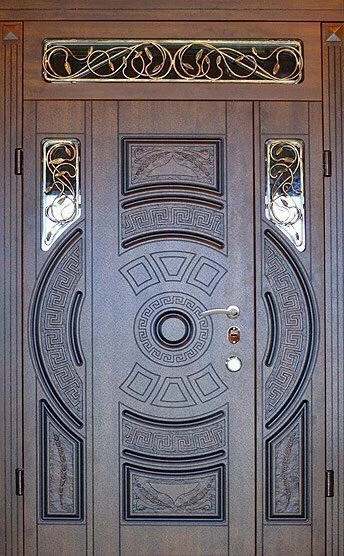 Парадные двери относятся к изделиям премиум-класса. Изготавливаются такие модели из металла толщиной не менее 2,0 мм, конструкция усиливается ребрами жесткости. Основной фактор, делающий парадные двери таковыми – их внешняя отделка. Для декора этих дверей, как правило, используют массив дуба, ясеня или сосны, натуральный шпон, корабельную фанеру, МДФ-панель, покрытую атмосфероустойчивой пленкой Винорит (VINORIT). Декоративные вставки из антивандального стекла, с применением элементов ковки, рисунок, который будет сочетаться с рисунком решеток на окнах, придаст коттеджу неповторимый внешний вид. Можно декорировать дверь витражным узором – и ваш дом заиграет яркими красками. По конструкции парадные двери могут быть как одностворчатыми, так и двустворчатым. При достаточной высоте проема, можно изготовить входную группу с декоративной вставкой сверху – прямоугольную или в виде арки. Терморазрыв в конструкции парадной двери сохранит тепло в доме, и предотвратит промерзание и кондедсирование двери в холодное время года, при этом не требуется обустройство в доме холодного тамбура.
